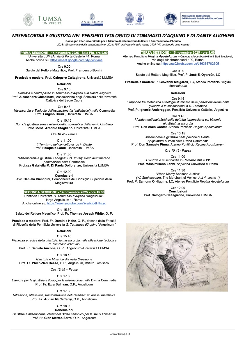 As part of the three-year celebrations in honor of St. Thomas Aquinas (2023–2025), LUMSA University, the Pontifical University of St. Thomas Aquinas – Angelicum, and the Pontifical Athenaeum Regina Apostolorum present the inter-university conference “Mercy and Justice in the Theological Thought of Thomas Aquinas and Dante Alighieri.”